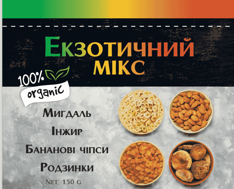 Екзотичний мікс, 150 грам - це чудовий мікс для поціновувачів екзотичних смаків, поживний та корисний. Склад: мигдаль - 25%, інжир - 25%, бананові чіпси - 25%, родзинки - 25%