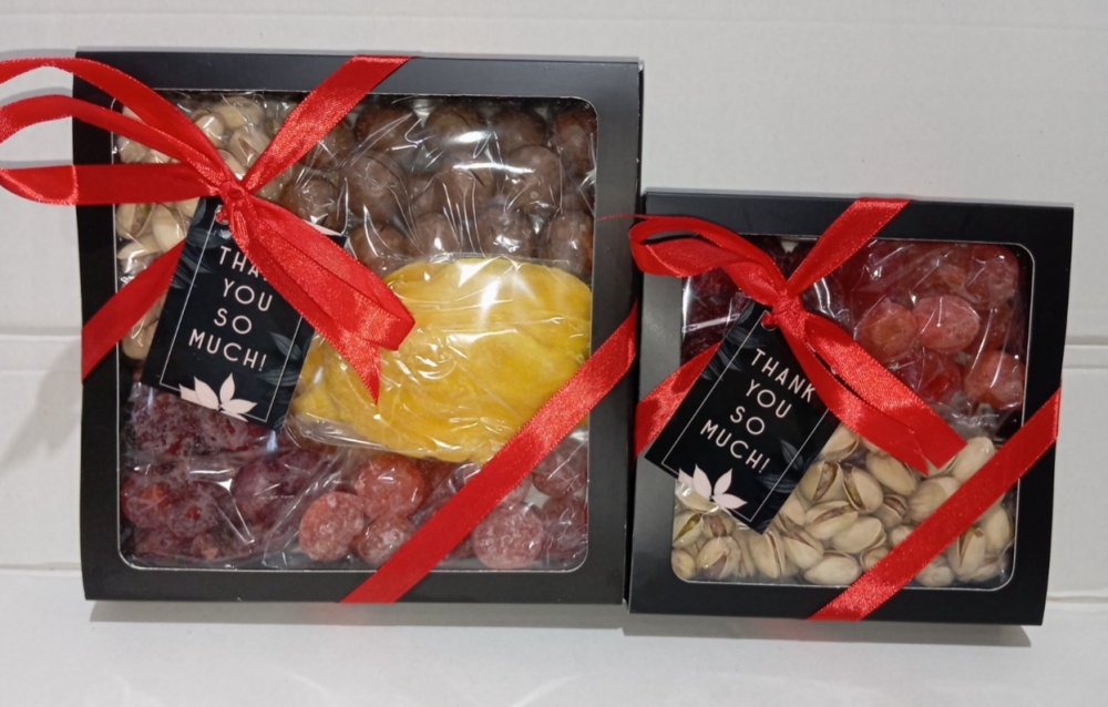 | Склад подарунку: | фісташка підсолена США - 100 г, макадамія в шкарлупі - 100 г, кумкват в пудрі - 100 г, манго сушене натуральне - 100 г, вишня цукати - 100 г |
