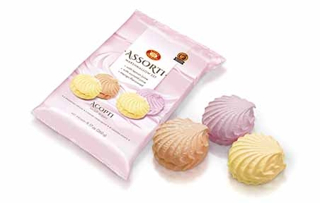 Набір зефіру Асорті (12 шт./260г), ХБФ - це набір зефіру трьох смаків: зефір з чорносмородиновим соком, зефір з лимонним соком, зефір зі смаком манго. Виробляється на основі натурального яблучного пюре (27,4%) й агар-агару.