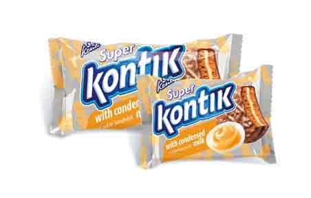 Печиво-сендвіч Супер Контік зі згущеним молоком (45 г, 90 г), Конті - це два печива з характерним смаком згущеного молока, поєднані шоколадно-вершковим кремом та залиті шоколадною глазур'ю.