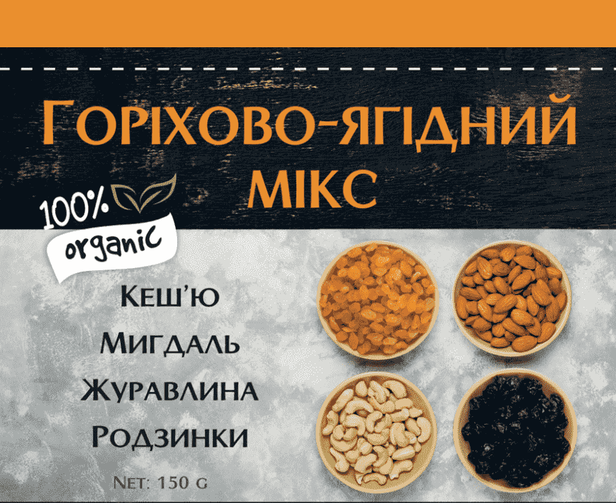 | Склад: | мигдаль - 25%, родзинки - 25%, кеш'ю- 25%, журавлина- 25%. |